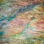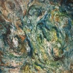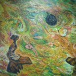 One painting is a called the Angry Stone of the Mountain God. It shows a natural stone in the Guizhou area that Artist Yin passes every day. The painting has a darkness, showing the anger of the Mountain God, which represents Nature. After Yin had completed the painting, his anger about the polluted environment was diminished. The art was a kind of release of emotion. Artist Yin explained that people are angry, but they don’t know how to express this anger. The artist can help create this communication. Like a volcano about to erupt, people have emotions which they do not express. Then sometimes there is an explosion.